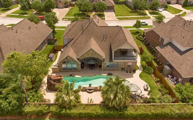 For family fun or entertaining – a backyard paradise offering custom pool/spa with 3 water falls & swim-in grotto, outdoor sound system surrounding deck & lush landscaping featuring palm trees, crepe myrtles, roses & more! Covered 2nd story balcony overlooks backyard oasis and the manicured preserve behind the home! Quiet cul-de-sac location with great curb appeal & covered front porch. As you enter, notice extensive rich wood flooring, arched doorways, recessed alcoves & heavy crown molding. Entry office with custom built-ins. Soaring ceilings, tall stone fireplace, extensive windows & abundant natural light in Family Room. Chef’s Kitchen showcases oversized island, a wealth of cabinetry & granite counter space, double ovens, gas range & butler’s pantry. Generous Master Suite has separate sitting area & charming fireplace. Luxurious Master Bathroom with separate vanities, frameless shower, jetted tub & walk-in closet with built-ins. Generous Game Room & 3 spacious bedrooms upstairs