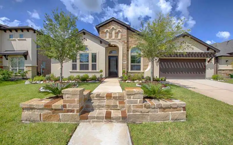 Stunning home, in West Ranch’s desirable Arbor Gate, features a stone/stucco front elevation that is sure to please! Foyer boasts beautiful wood flooring that extends throughout much of the home, as well as high ceilings & grand hallways that Perry Homes is known for! Study has beautiful French doors for privacy, perfect for someone who works from home! The amazing Kitchen is sure to please the chef in the home, with gorgeous quartz counters, huge island, breakfast bar seating, high end appliances, including double ovens & gas cooktop & a walk-in pantry. The Family Room has great views to the pool-sized backyard & a charming, corner fireplace. The Game Room, located off Formal Dining, has French doors to keep the fun contained! Generous Master Suite, with an abundance of natural lighting, leads to the luxurious Master Bathroom, boasting garden tub, dual vanities, mud-set shower & walk-in closet (which all Secondary bedrooms also feature). Covered porch with 2 big fans! No flooding!
